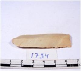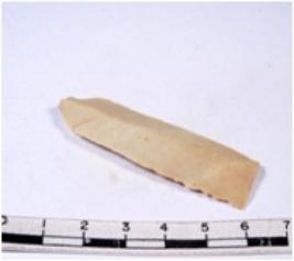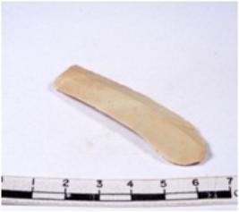 | Description / विवरण | A fragment of a rectangular shaped chert blade showing dorsal sides with sharp cutting edges having smooth surface and triangular section. |
