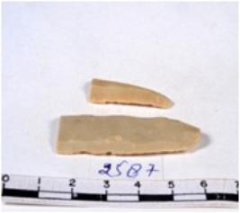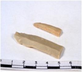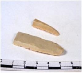 | Description / विवरण | A fragment of a rectangular shaped chert blade showing dorsal sides with sharp cutting edges having smooth surface and triangular section. |