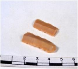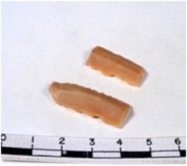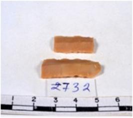 | Description / विवरण | A fragment of a rectangular shaped chert blade showing dorsal sides with sharp cutting edges having smooth surface and triangular section. |
