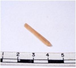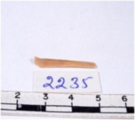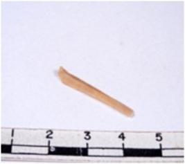 | Description / विवरण | A fragment of a rectangular shaped chert blade showing dorsal sides with sharp cutting edges having smooth surface and triangular section. |