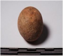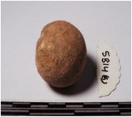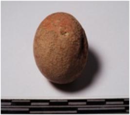 | Description / विवरण | A terracotta sling ball, round in shape of smooth surface. |