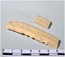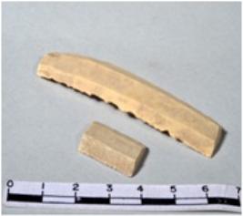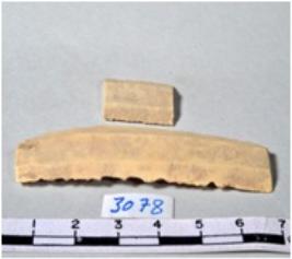 | Description / विवरण | A fragment of a rectangular shaped chert blade showing flat sides with sharp cutting edges having smooth surface and oval section. |
