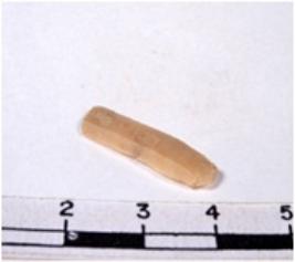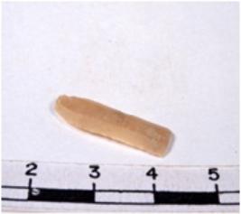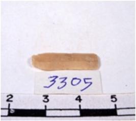 | Description / विवरण | A fragment of a rectangular shaped chert blade showing dorsal sides with sharp cutting edges having smooth surface and triangular section. |