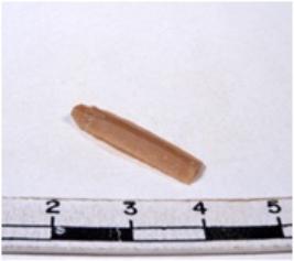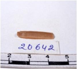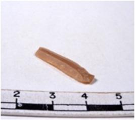 | Description / विवरण | A fragment of a rectangular shaped chert blade showing dorsal sides with sharp cutting edges having smooth surface and triangular section. |