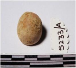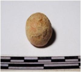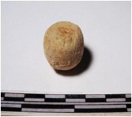 | Description / विवरण | A terracotta round in shape sling ball slightly broken of smooth surface. |