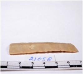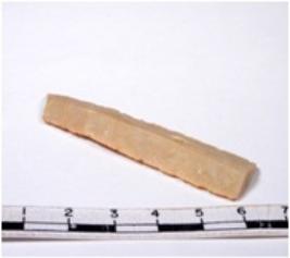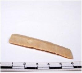 | Description / विवरण | A fragment of a rectangular shaped chert blade showing dorsal sides with sharp edges having smooth surface and triangular section. |