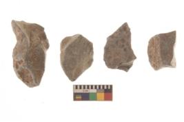 | Description / विवरण | There are n 4 utilized flakes. There are multi directional irregular scar pattern on both dorsal and ventral face of the flakes. three are tapering at one end and one has blunted edge. |