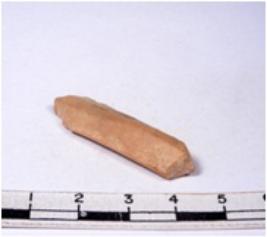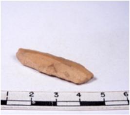| Description / विवरण | A fragment of a rectangular shaped chert blade showing dorsal sides with sharp cutting edges having smooth surface and triangular section. |