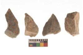 | Description / विवरण | There are n 4 utilized flakes. There are multi directional irregular scar pattern on both dorsal and ventral face of the flakes. three are tapering at one end and one has sharp edge. |