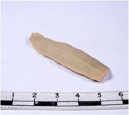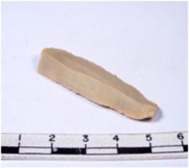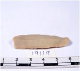 | Description / विवरण | A fragment of a rectangular shaped chert blade showing dorsal sides with sharp edges having smooth surface and triangular section. |