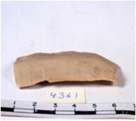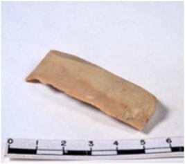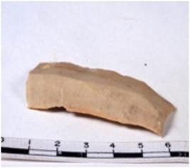 | Description / विवरण | A fragment of a rectangular shaped chert blade showing dorsal sides with sharp cutting edges having smooth surface and triangular section. |