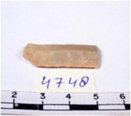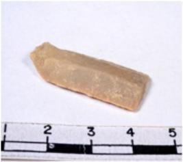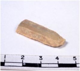 | Description / विवरण | A fragment of a rectangular shaped chert blade showing dorsal sides with sharp cutting edges having smooth surface and triangular section. |