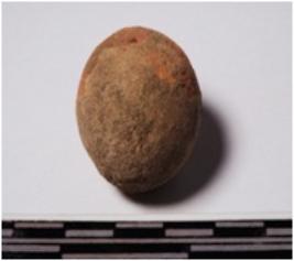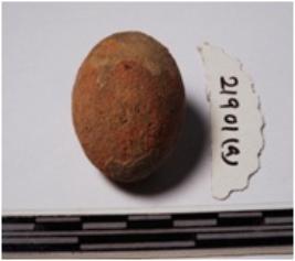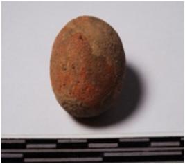 | Description / विवरण | A terracotta sling ball, round in shape of smooth surface. |