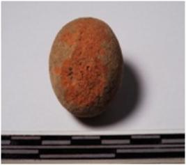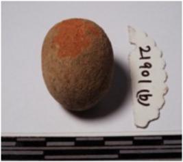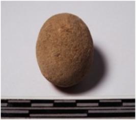 | Description / विवरण | A terracotta sling ball, round in shape of smooth surface. |