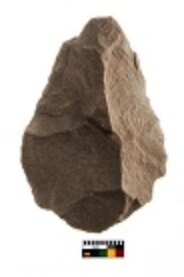 | Description / विवरण | Specimen of a handaxe with round butt and bold flaking |