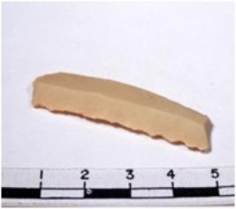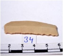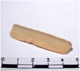| Description / विवरण | A buff chert blade showing parallel sides with sharp edges having smooth surface and trapezoidal section broken from both ends. |