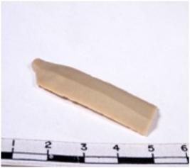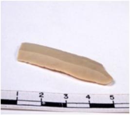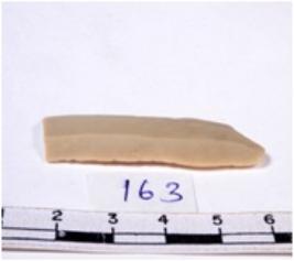 | Description / विवरण | Chert blade tool, brownish, thin, broad, parallel sided, single ribbed blade, both ends truncated, with sharp retouched margins, and trapezoidal section. |