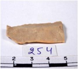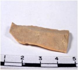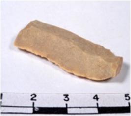 | Description / विवरण | A chert buff coloured broad parallel sided blade. Its both ends are truncated; both margins, battered by use, retouching is evident, triangular section. |