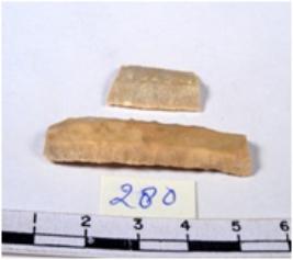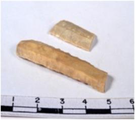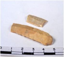 | Description / विवरण | Two fragmentary blade tools, brownish, broad, sharp parallel sided, single ribbed blades, both ends truncated both the blades, trapezoidal section. Gray bans visible on small blade. |