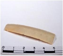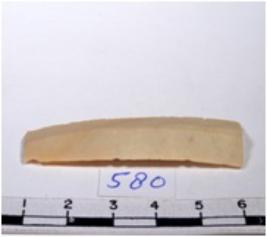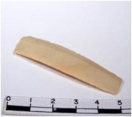 | Description / विवरण | A fragment of a rectangular shaped chert blade showing dorsal sides with sharp cutting edges having smooth surface and triangular section. |