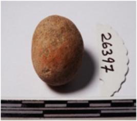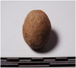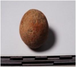 | Description / विवरण | A terracotta sling ball, round in shape of smooth surface. |
