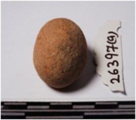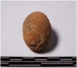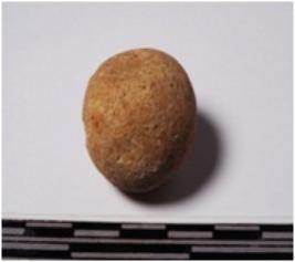 | Description / विवरण | A terracotta sling ball, round in shape of smooth surface. |