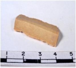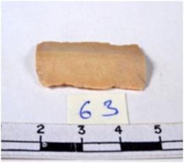 | Description / विवरण | Buff coloured patinated broad parrallel sided blade. Its both ends are truncated; both margins cutting, battered by use, retouching is evident. Triangular section. |