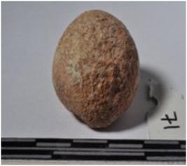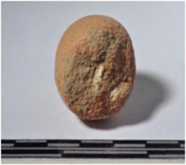 | Description / विवरण | A terracotta sling ball, round in shaped and rough surface. |