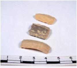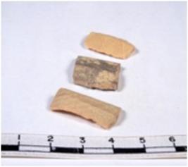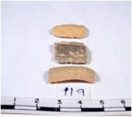 | Description / विवरण | Three blade tools. The blades are of chert, buff coloured, broad, parallel sided, double ribbed blades, truncated ends, with sharp retouched margins of three blades, and trapezoidal in section. Where as one have curved end with sharp edges. |