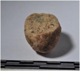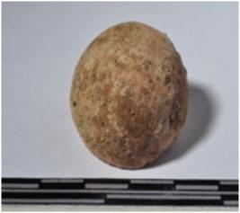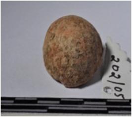 | Description / विवरण | A fragment of a terracotta sling ball, globular shaped and rough surface. |