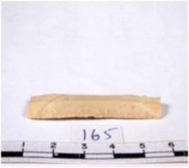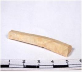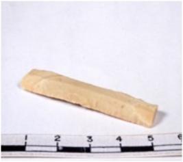 | Description / विवरण | Chert blade tool, brownish, thin, broad, parallel sided, single ribbed blade, both ends truncated, with sharp retouched margins, and triangular section. |
