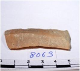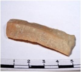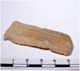 | Description / विवरण | A fragment of a rectangular shaped chert blade showing dorsal sides with sharp cutting edges having smooth surface and triangular section. |