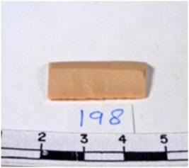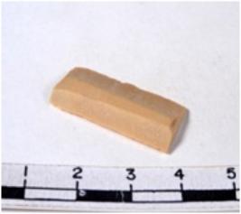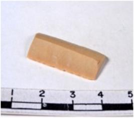 | Description / विवरण | Chert blade, buff grayish with brown spots, thick, broad, parallel sided, double ribbed, both ends truncated, with sharp retouched margins, and triangular in section. |