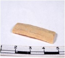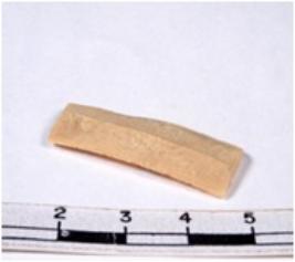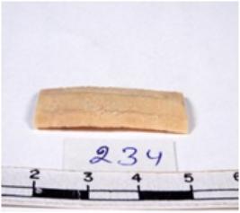 | Description / विवरण | Chert blade, buff grayish with brown spots, thick, broad, parallel sided, double ribbed, both ends truncated, with sharp retouched margins, and trapezoidal in section. |