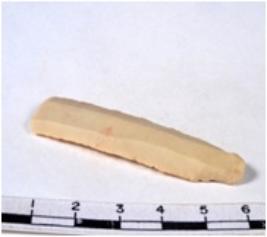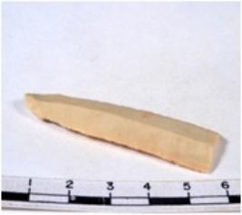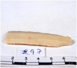 | Description / विवरण | Fragmentary blade, brownish, thick, broad, parallel sided, double-ribbed blade, both ends truncated, with sharp retouched margins, serration produced by evident retouching. Trapezoidal section. |