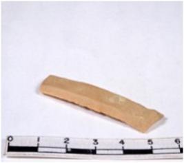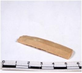 | Description / विवरण | Brownish fragmentary chert blade, brown, thick, broad, parallel sided, double ribbed blade, both ends truncated, with sharp retouched margins, and trapezoidal in section. |