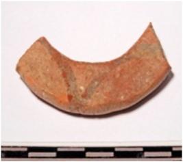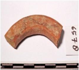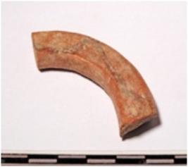 | Description / विवरण | A fragment of a terracotta bangle, rectangular in section painted with loop design in black on the one side and smooth surface. |