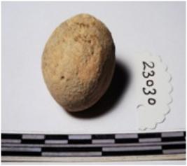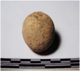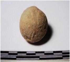 | Description / विवरण | A terracotta round in shape sling ball of rough surface. |