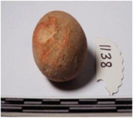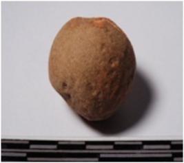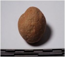| Description / विवरण | A terracotta sling ball round in shape slightly broken from one side of smooth surface. |