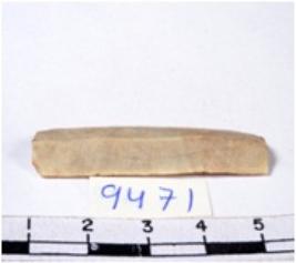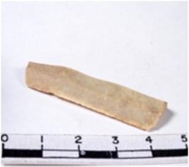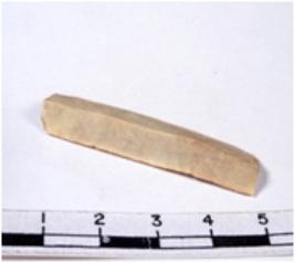| Description / विवरण | A fragment of a rectangular shaped chert blade showing dorsal sides with sharp cutting edges having smooth surface and triangular section. |