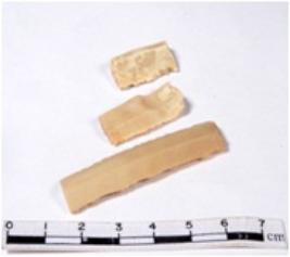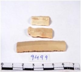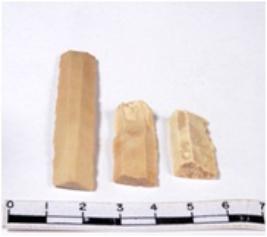 | Description / विवरण | A fragment of a rectangular shaped chert blade showing dorsal sides with sharp cutting edges having smooth surface and triangular section. |