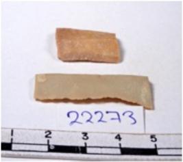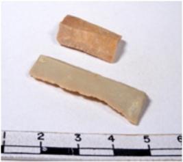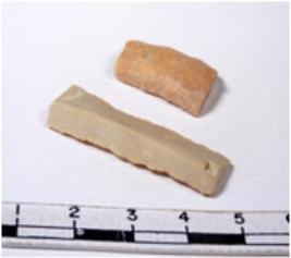 | Description / विवरण | A fragment of a rectangular shaped chert blade showing dorsal sides with sharp cutting edges having smooth surface and triangular section. |