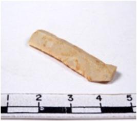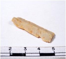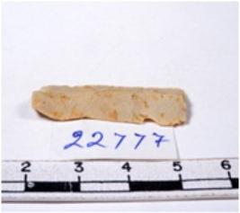 | Description / विवरण | A fragment of a rectangular shaped chert blade showing dorsal sides with sharp cutting edges having smooth surface and triangular section. |