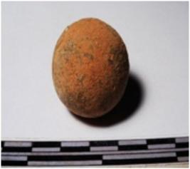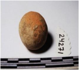 | Description / विवरण | A terracotta round in shape sling ball of rough surface. |
