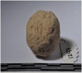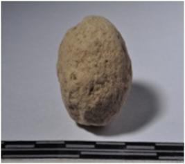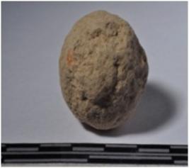 | Description / विवरण | A terracotta sling ball, round in shaped and rough surface. |