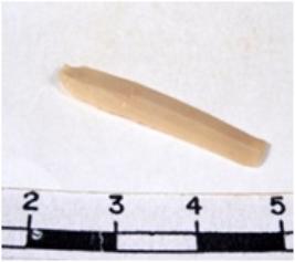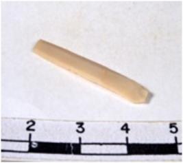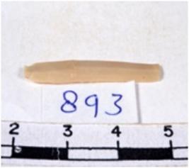 | Description / विवरण | A fragment of a rectangular shaped chert blade showing dorsal sides with sharp cutting edges having smooth surface and triangular section. |