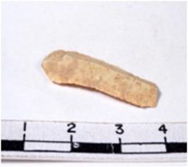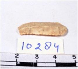 | Description / विवरण | A fragment of a rectangular shaped chert blade showing dorsal sides with sharp cutting edges having smooth surface and triangular section. |