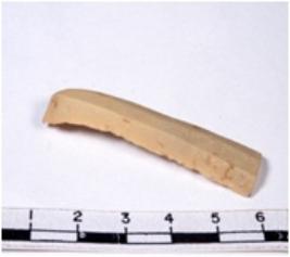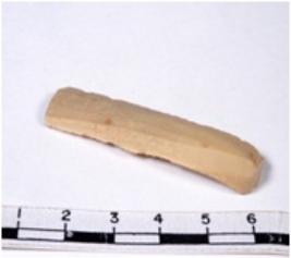 | Description / विवरण | A fragment of a rectangular shaped chert blade showing dorsal sides with sharp cutting edges having smooth surface and triangular section. |