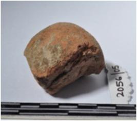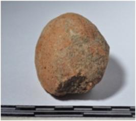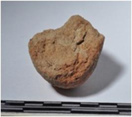 | Description / विवरण | A fragment of a terracotta sling ball, globular shaped and smooth surface. |