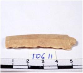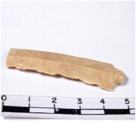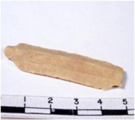 | Description / विवरण | A fragment of a rectangular shaped chert blade showing dorsal sides with sharp cutting edges having smooth surface and triangular section. |